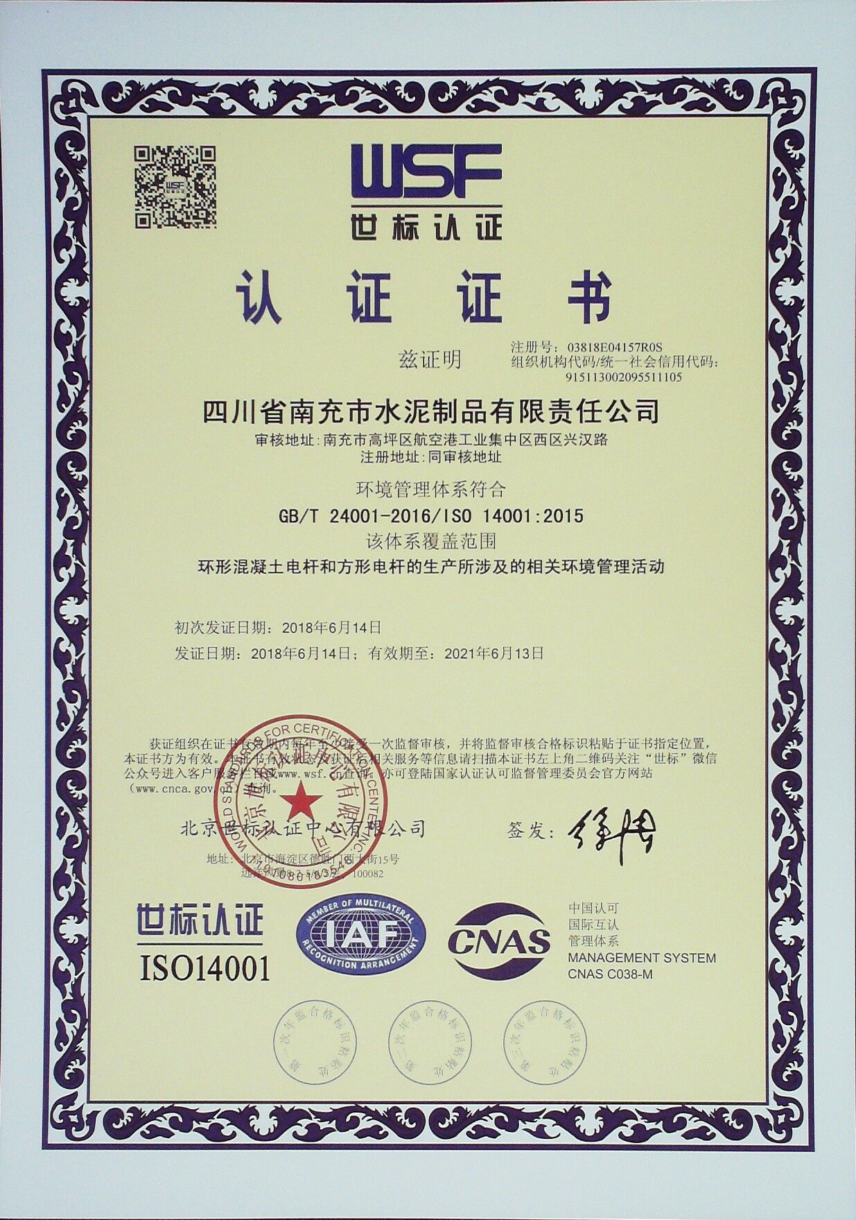 環(huán)境體系認(rèn)證證書